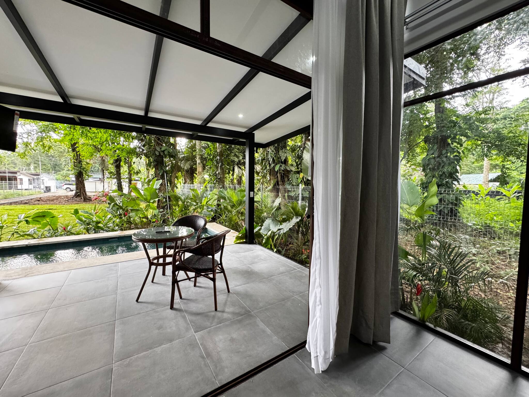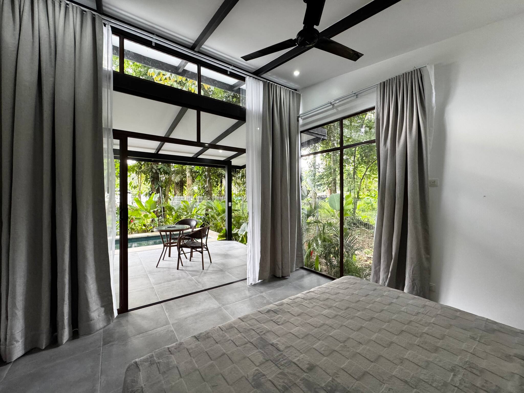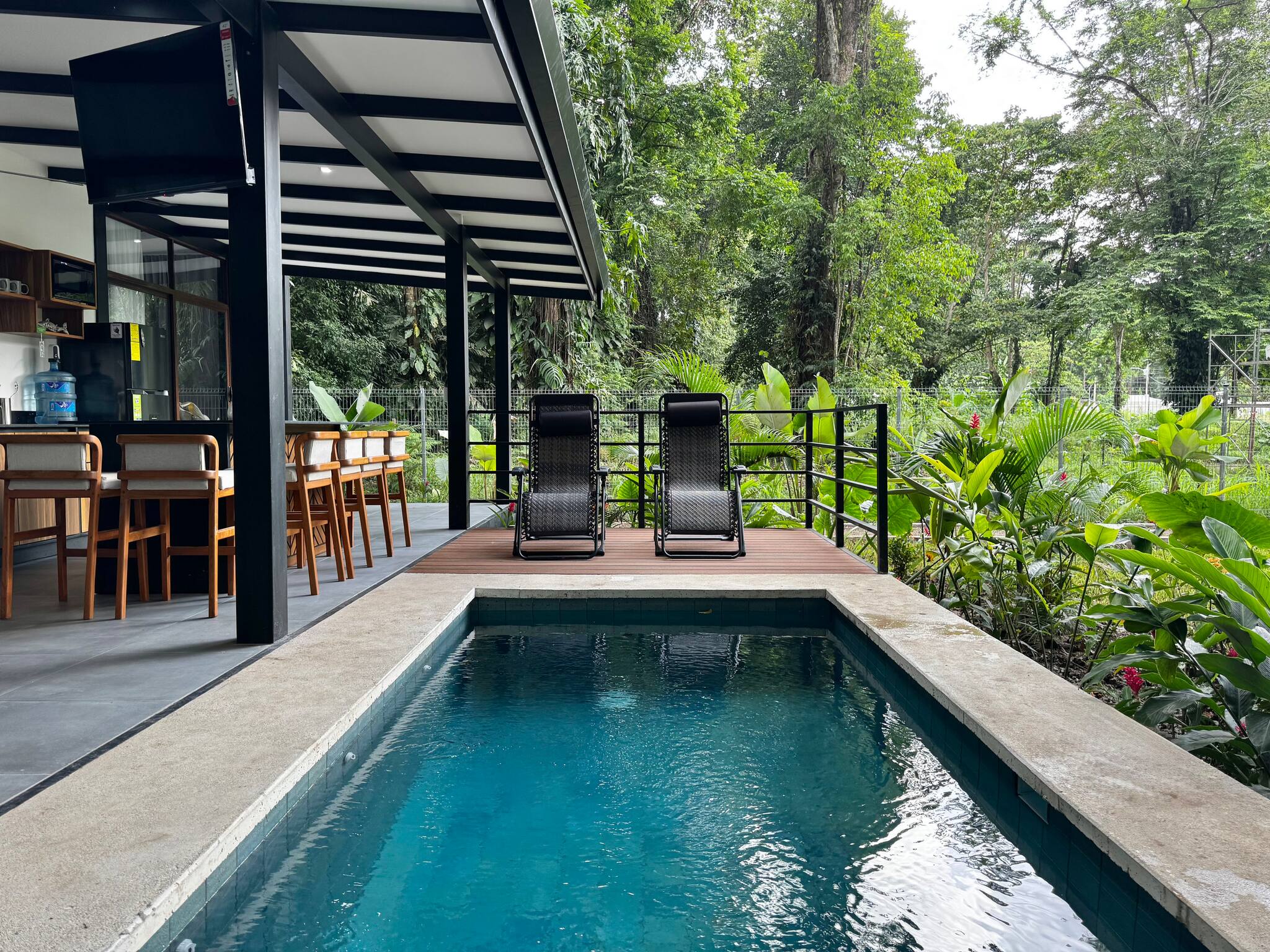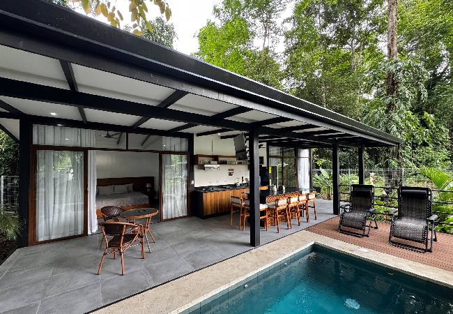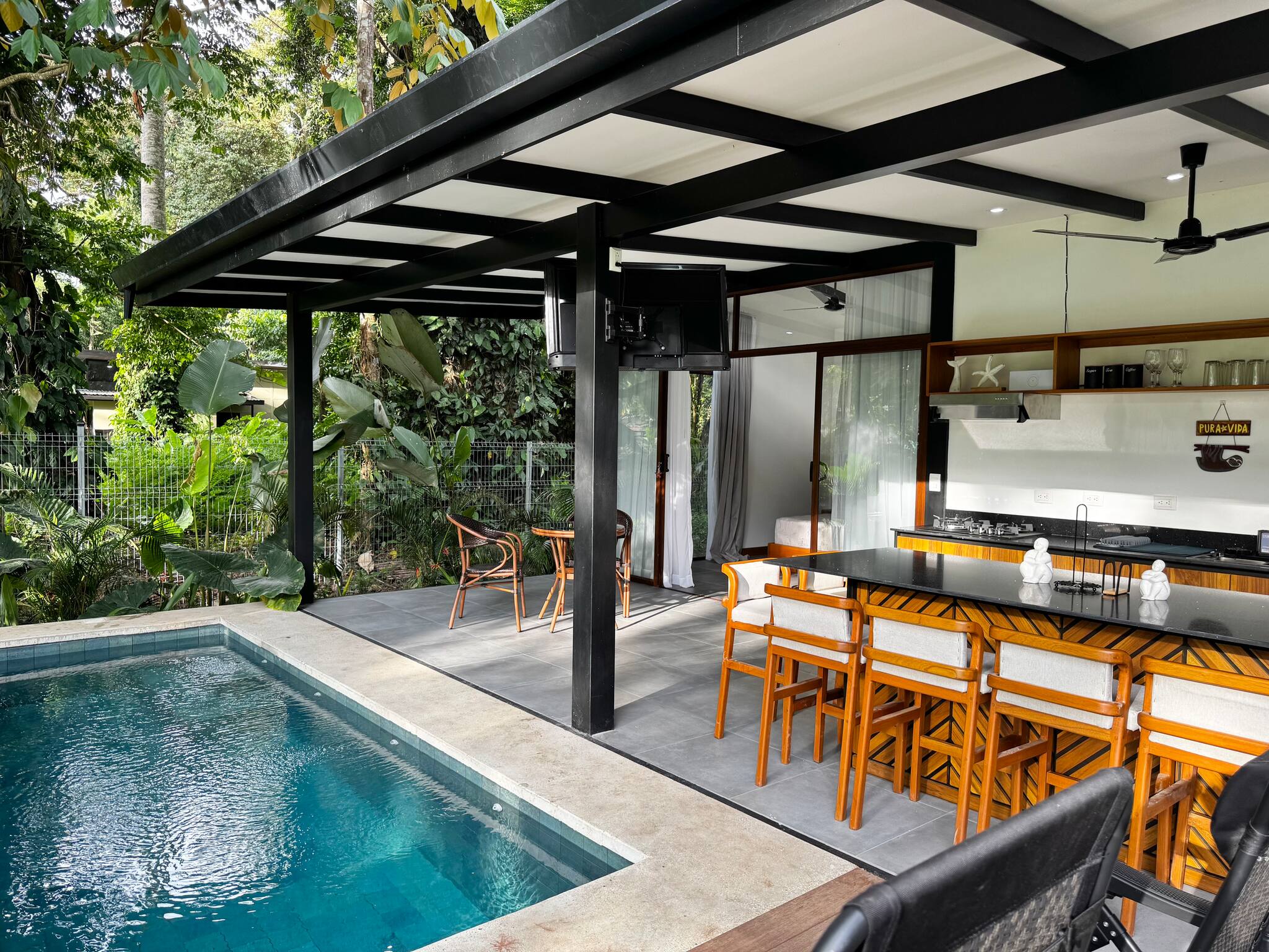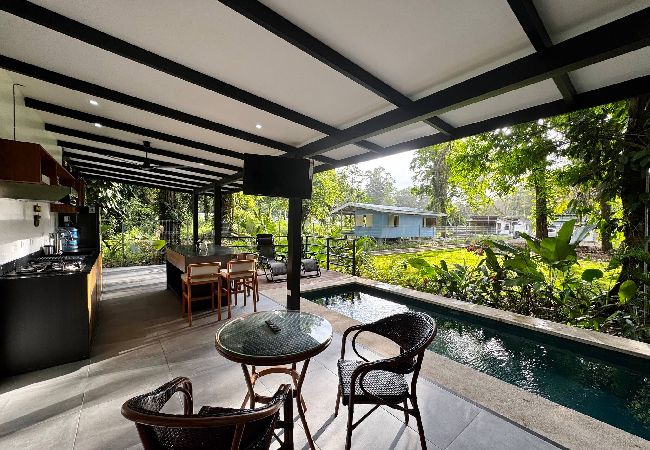 La casa en Puerto Viejo posee 2 habitaciones y capacidad para 6 personas. Alojamiento de 80 m². Dispone de jardín, mobiliario jardín, terraza, asador, acceso internet (wifi), aire acondicionado, alberca privada, garage en mismo edificio, 1 Televisión.La cocina americana, de gas, está equipada con refrigerador, microondas, vajilla/cubertería, utensilios/cocina, cafetera y fogones.