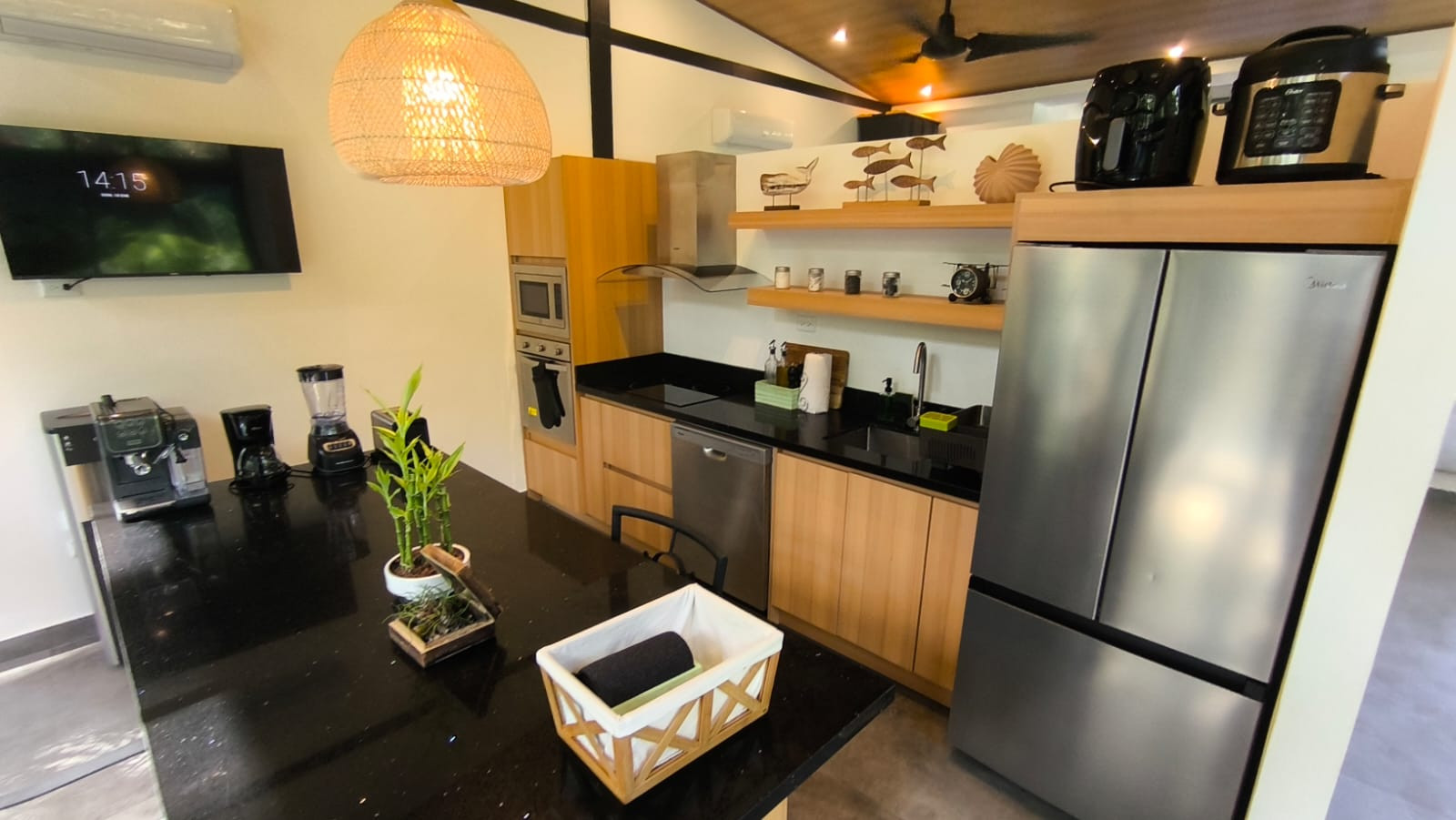 La cocina americana, de inducción, está equipada con refrigerador, microondas, horno, lavavajillas, vajilla/cubertería, utensilios/cocina, cafetera, freidora y hervidor de agua.