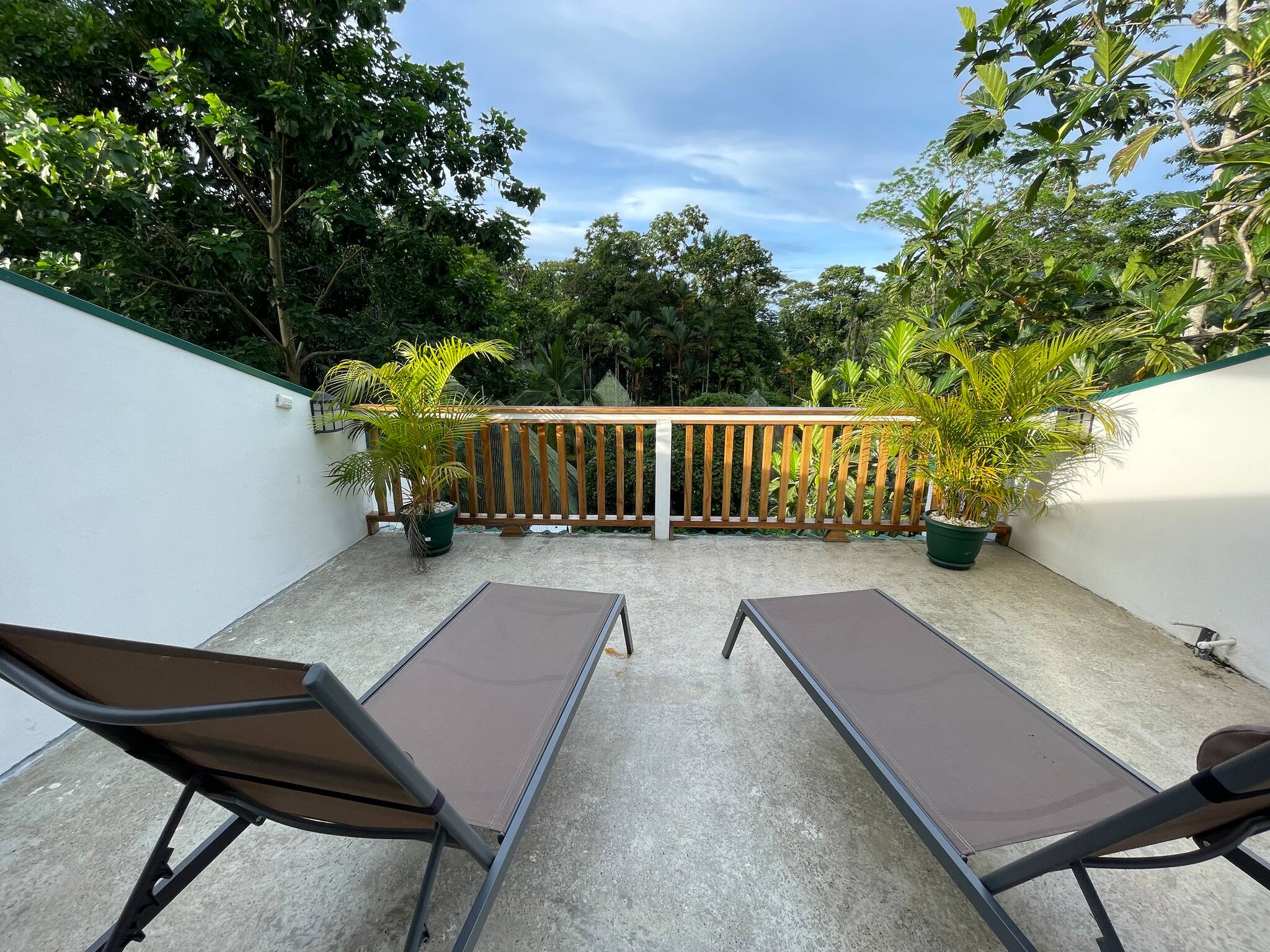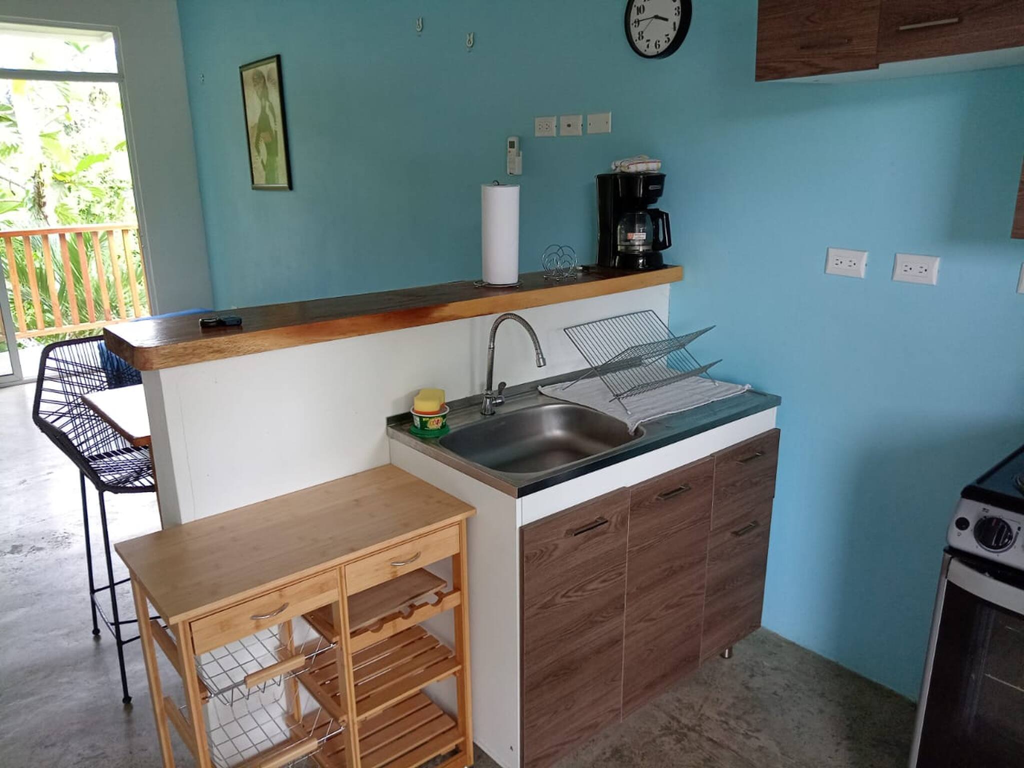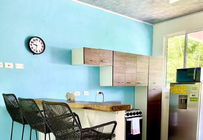 The apartment also offers a full bathroom with hot water, a fully equipped kitchen with breakfast bar, a laundry area with utility sink, and balconies at the front and back to enjoy the outdoors. Long-term stays are welcome, making it an excellent option for those looking to work remotely or simply settle in for an extended stay in this little corner of paradise.
