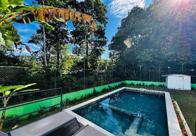 On the top floor, a shared lounge invites you to relax with a cup of coffee, read, work comfortably, or simply surrender to the calm of the surroundings. The property is fully fenced and features a refreshing pool nestled in the heart of the garden, an electric gate, private parking, and a charging station for electric vehicles.