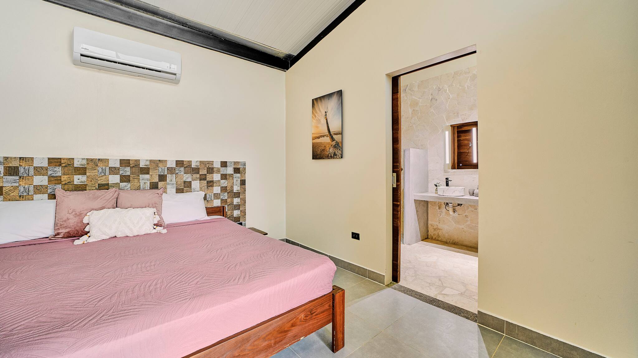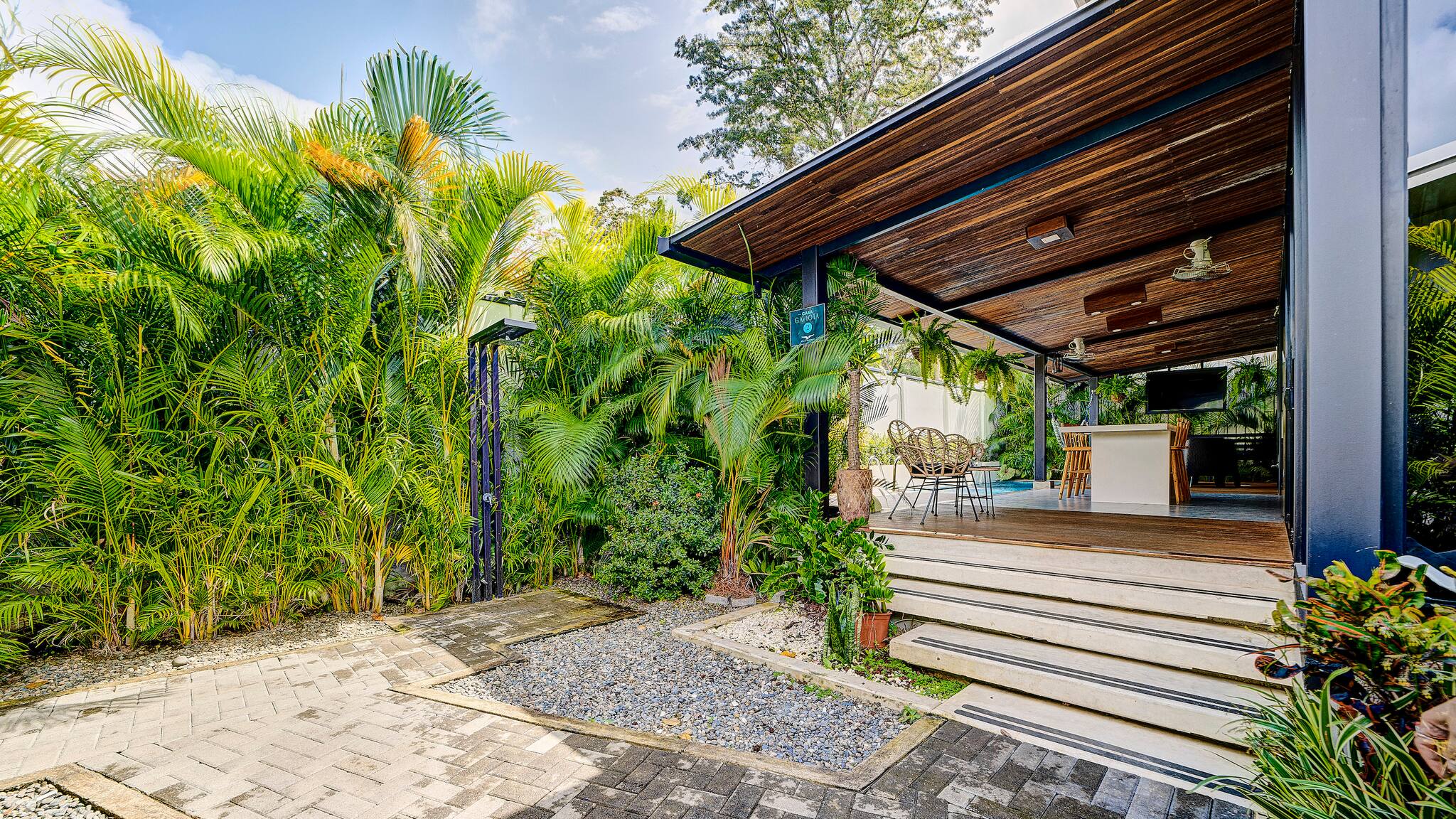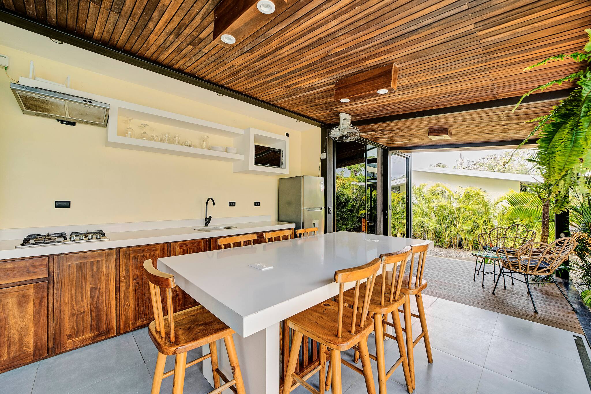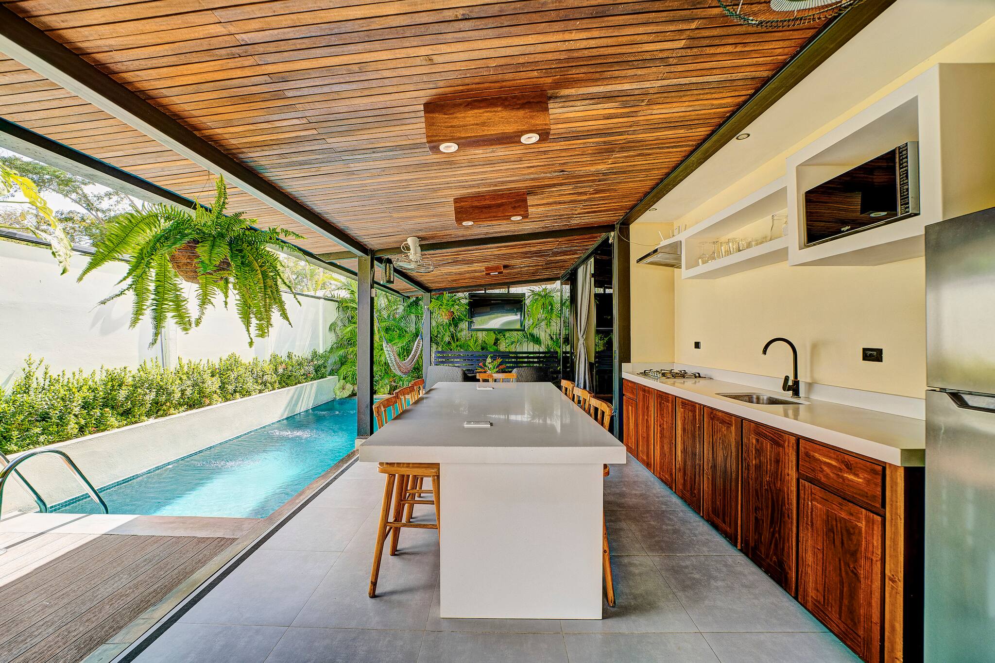 The house accommodates up to eight guests and features three bedrooms, all with air conditioning and private bathrooms. The master bedroom includes a king-size bed, Smart TV, and walk-in closet, while the other two offer queen beds; one of them also includes a Smart TV. The living room features a comfortable double sofa bed. Upstairs, you’ll find a fully equipped kitchen that opens onto a covered terrace with a dining table and a cozy IPTV lounge area, plus a half bathroom. The garden and beach-style pool, with a BBQ rancho beside it, create the perfect setting to enjoy tropical life. Also ideal for longer stays or remote work in comfort.