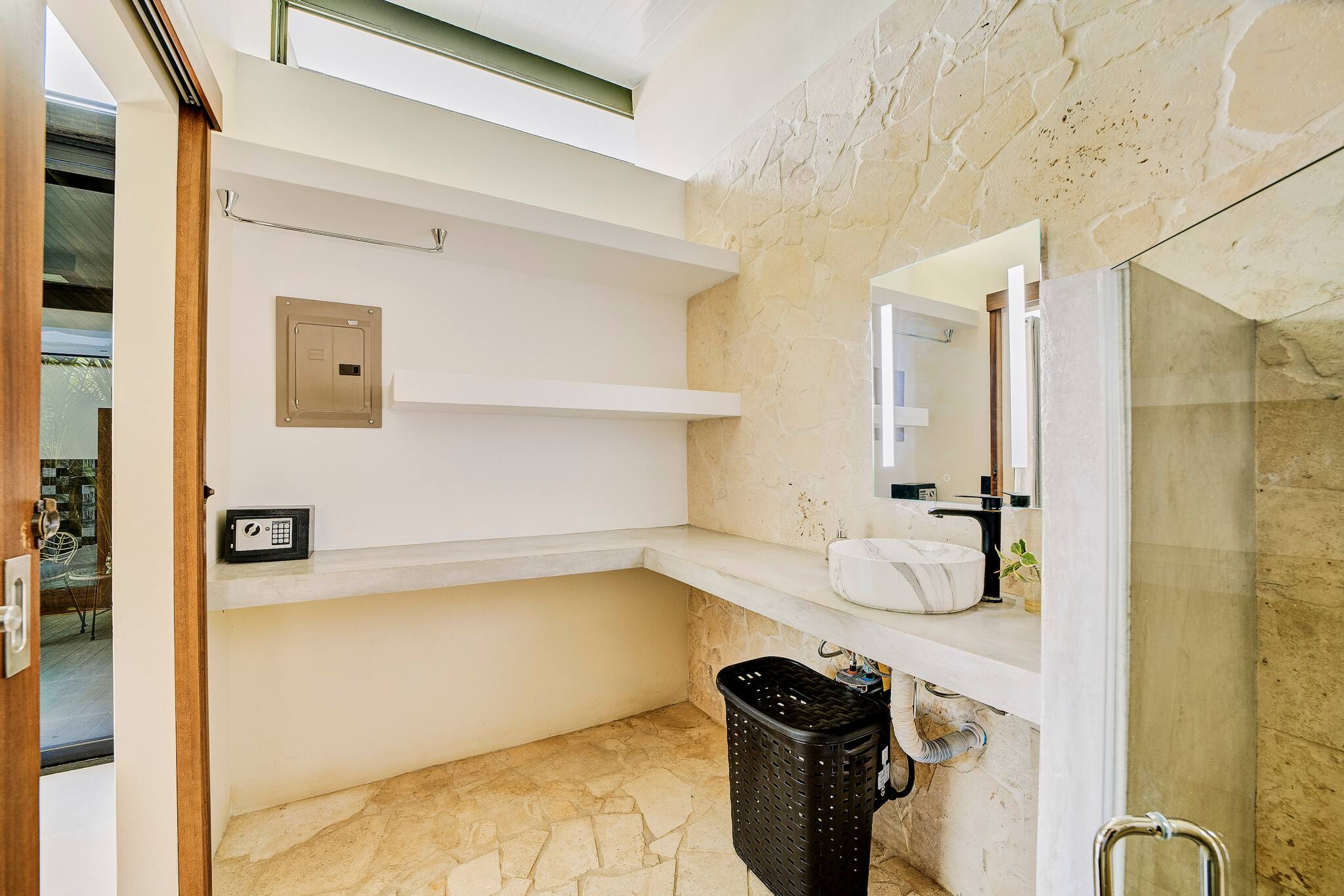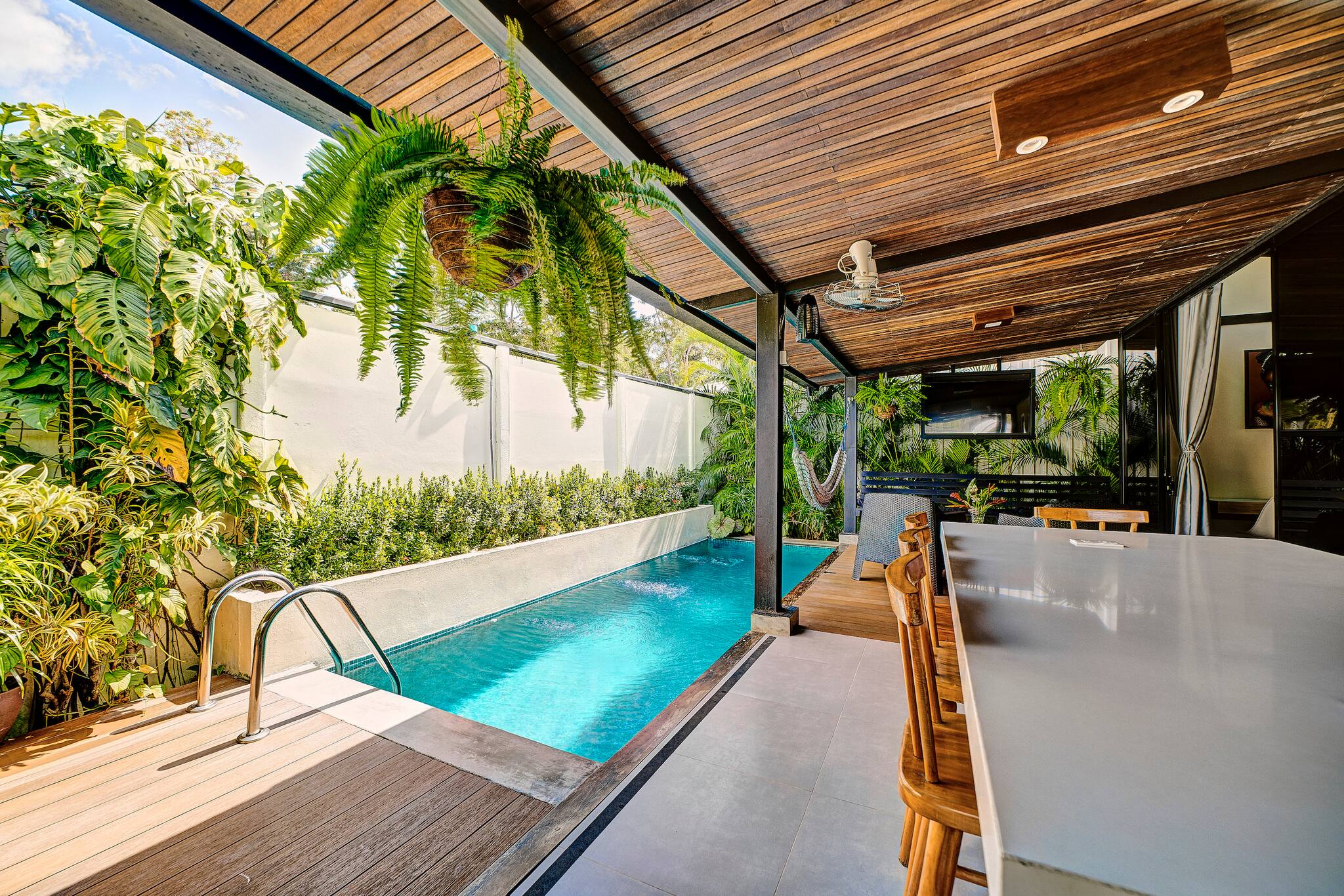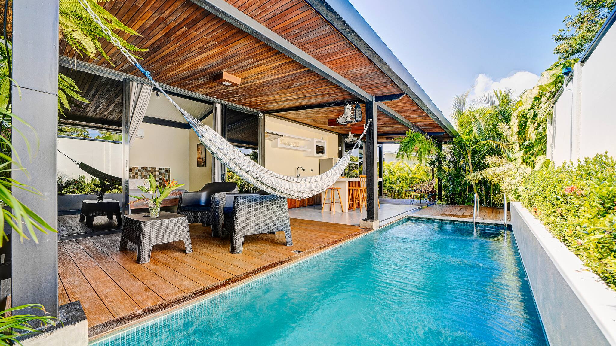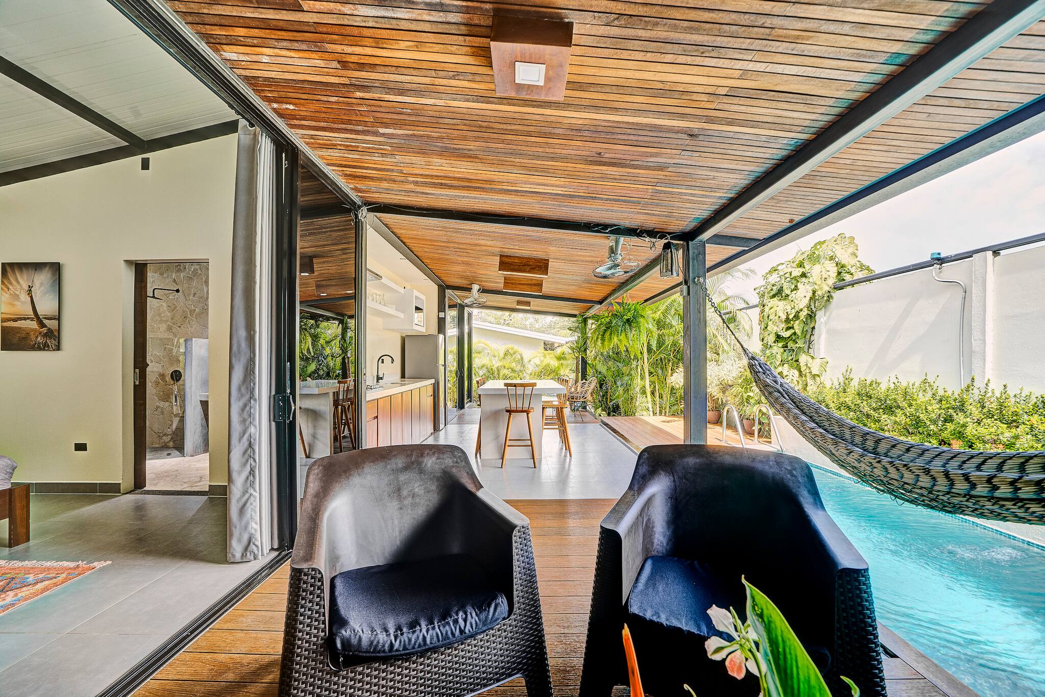 The house accommodates up to eight guests and features three bedrooms, all with air conditioning and private bathrooms. The master bedroom includes a king-size bed, Smart TV, and walk-in closet, while the other two offer queen beds; one of them also includes a Smart TV. The living room features a comfortable double sofa bed. Upstairs, you’ll find a fully equipped kitchen that opens onto a covered terrace with a dining table and a cozy IPTV lounge area, plus a half bathroom. The garden and beach-style pool, with a BBQ rancho beside it, create the perfect setting to enjoy tropical life. Also ideal for longer stays or remote work in comfort.