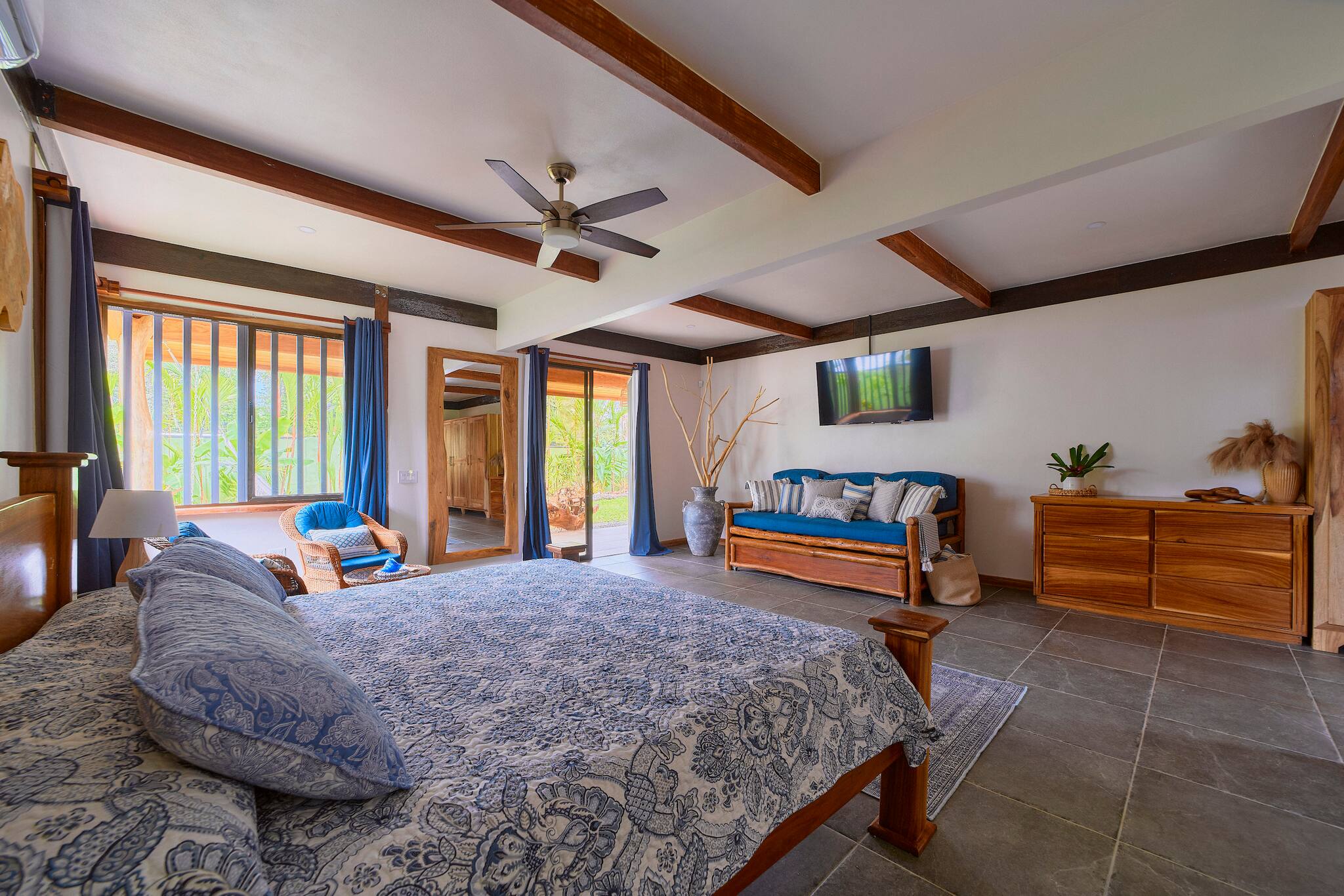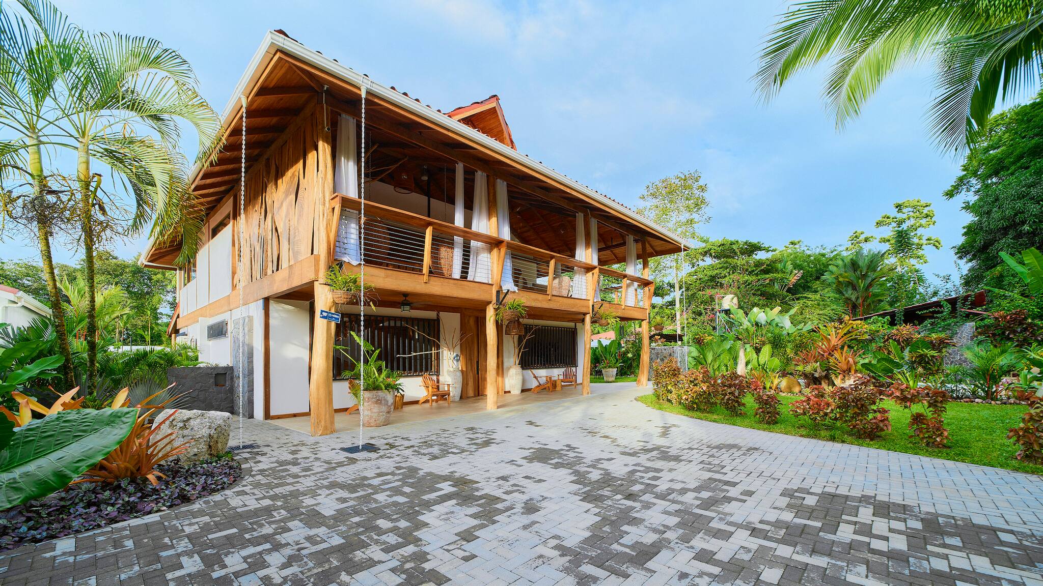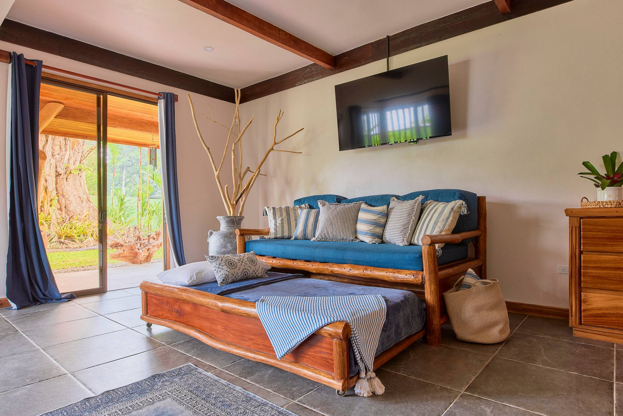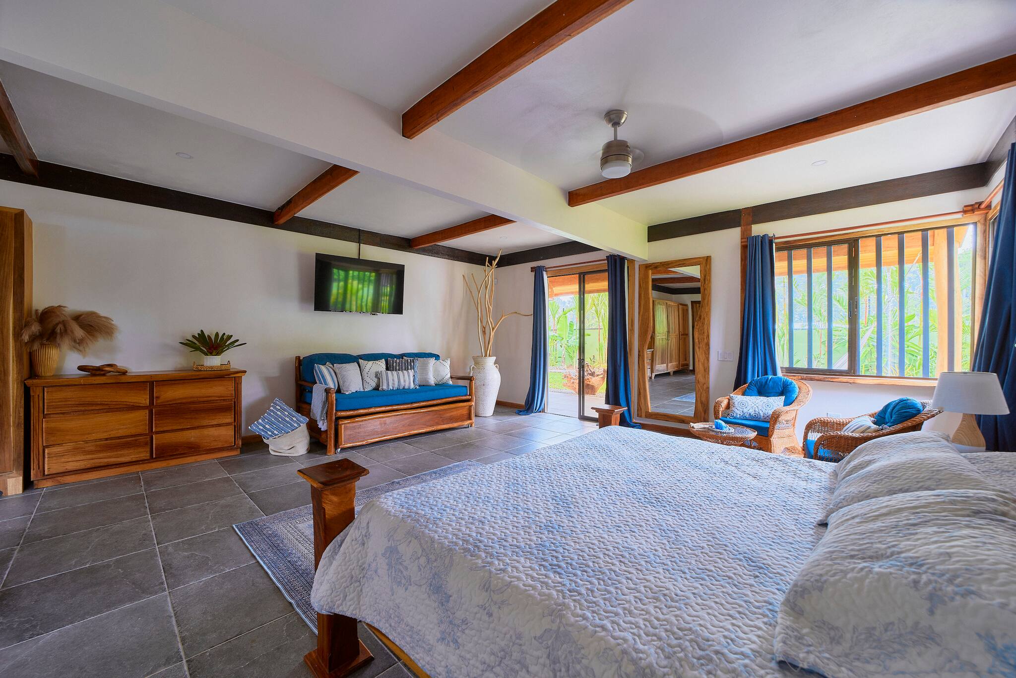 The home accommodates up to six guests and features two spacious master suites on the ground floor—each with a California king bed, an individual sofa bed, air conditioning, Smart TV, and a private luxury bathroom with rainfall shower. Both rooms open to a peaceful back patio with hammocks. Upstairs, you'll find an open living space with a chef-designed kitchen, oversized dining table, lounge area, a guest half-bath, and stunning woodwork throughout. The property also includes a gas BBQ, high-speed internet, parking for two vehicles, and welcomes long-term stays. Casa Masha is more than a vacation rental—it’s a living work of art that embodies the spirit of Costa Rica.