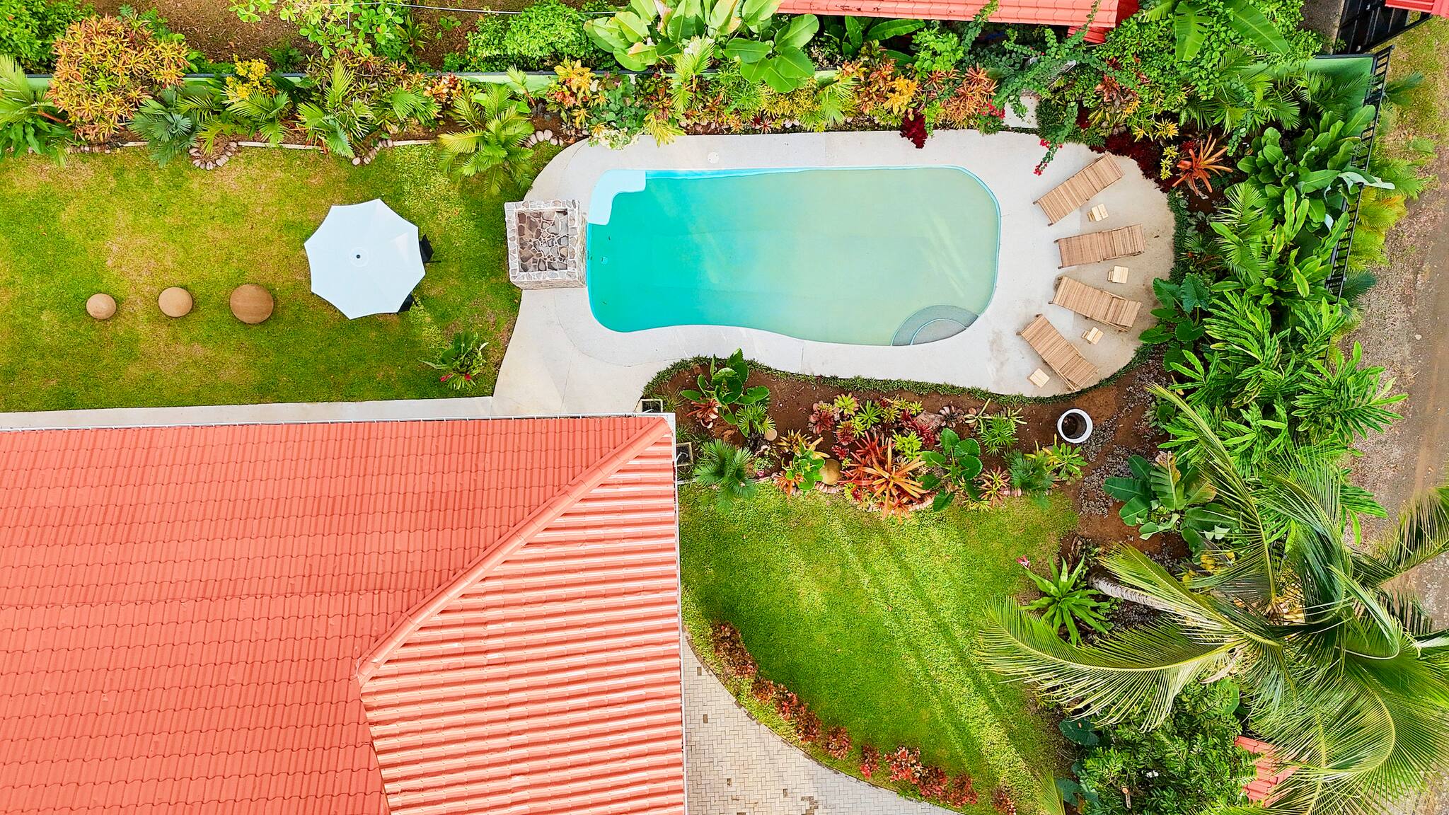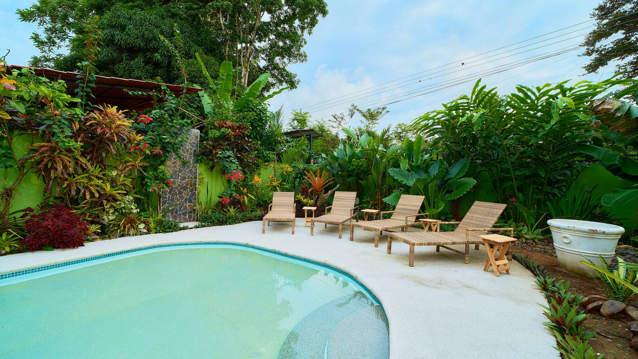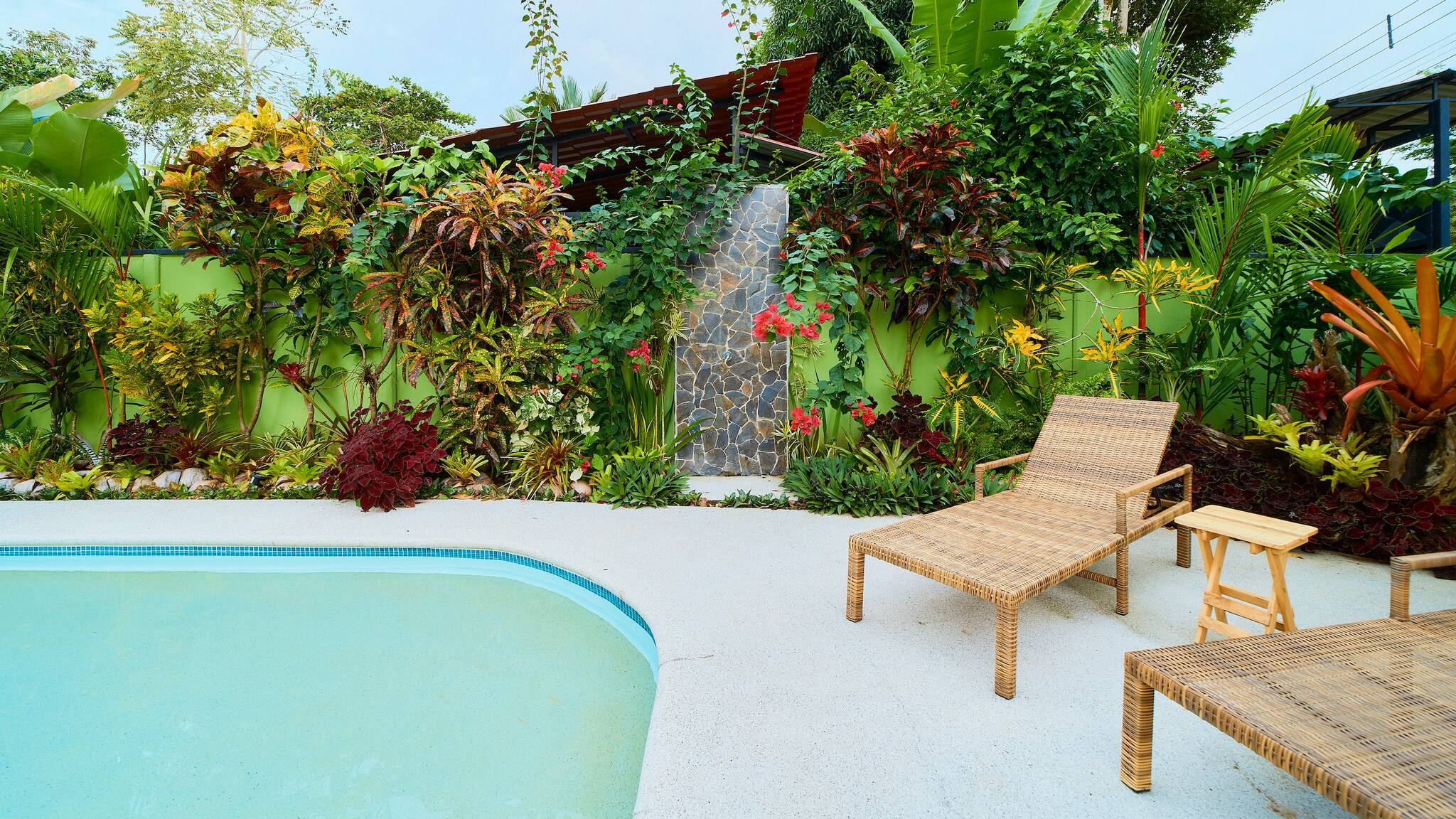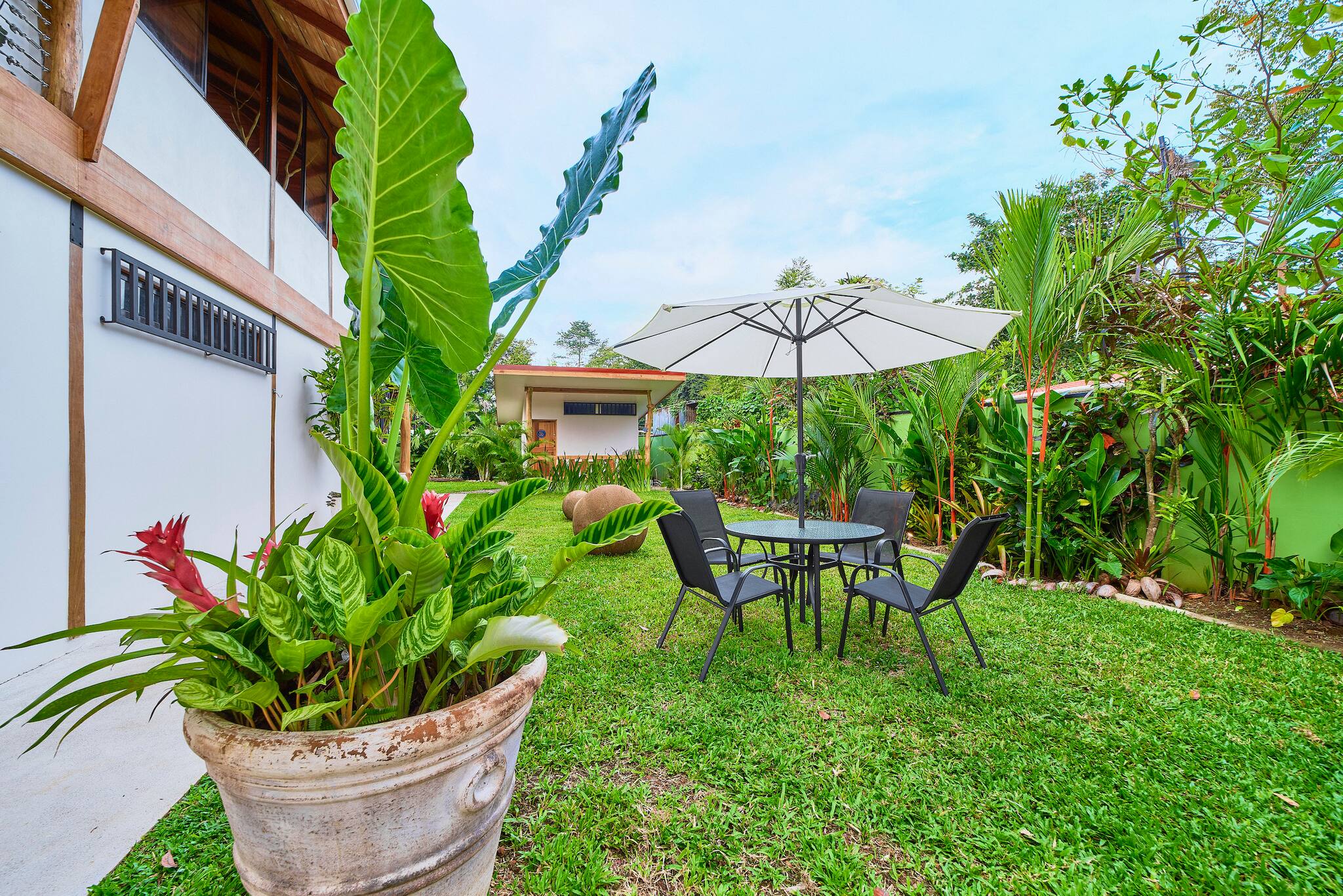 Outside, a beautiful pool overlooks the lush gardens—perfect for cooling off after a day at the beach. The property also offers private parking for up to three vehicles and an electric gate for added security.