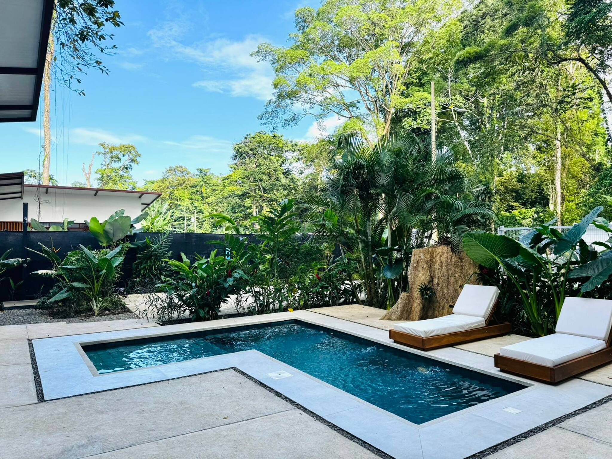 Relax in this private tropical retreat, perfect for families or groups of up to 7. The home features 3 air-conditioned bedrooms, including a king suite with private bath, a queen room, and bunk beds with a double and twin. Enjoy a fully equipped kitchen, open living area with Smart TV, and a lush outdoor space with a private pool. The fully enclosed property offers parking, privacy, and a peaceful setting surrounded by nature. Pet friendly and ideal for relaxing after a day of adventure.