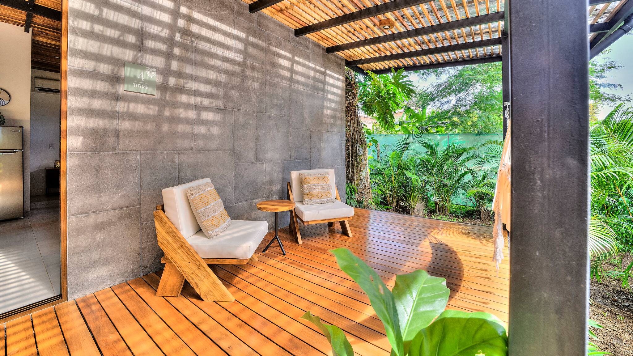 Each villa features a queen bed, a double sofa bed, air conditioning, Smart TV, a fully equipped kitchen with breakfast bar, a full bathroom, and high-speed Starlink satellite internet. Outside, a private terrace with a table, chairs, and a hammock offers the perfect space to unwind and enjoy the surrounding nature.