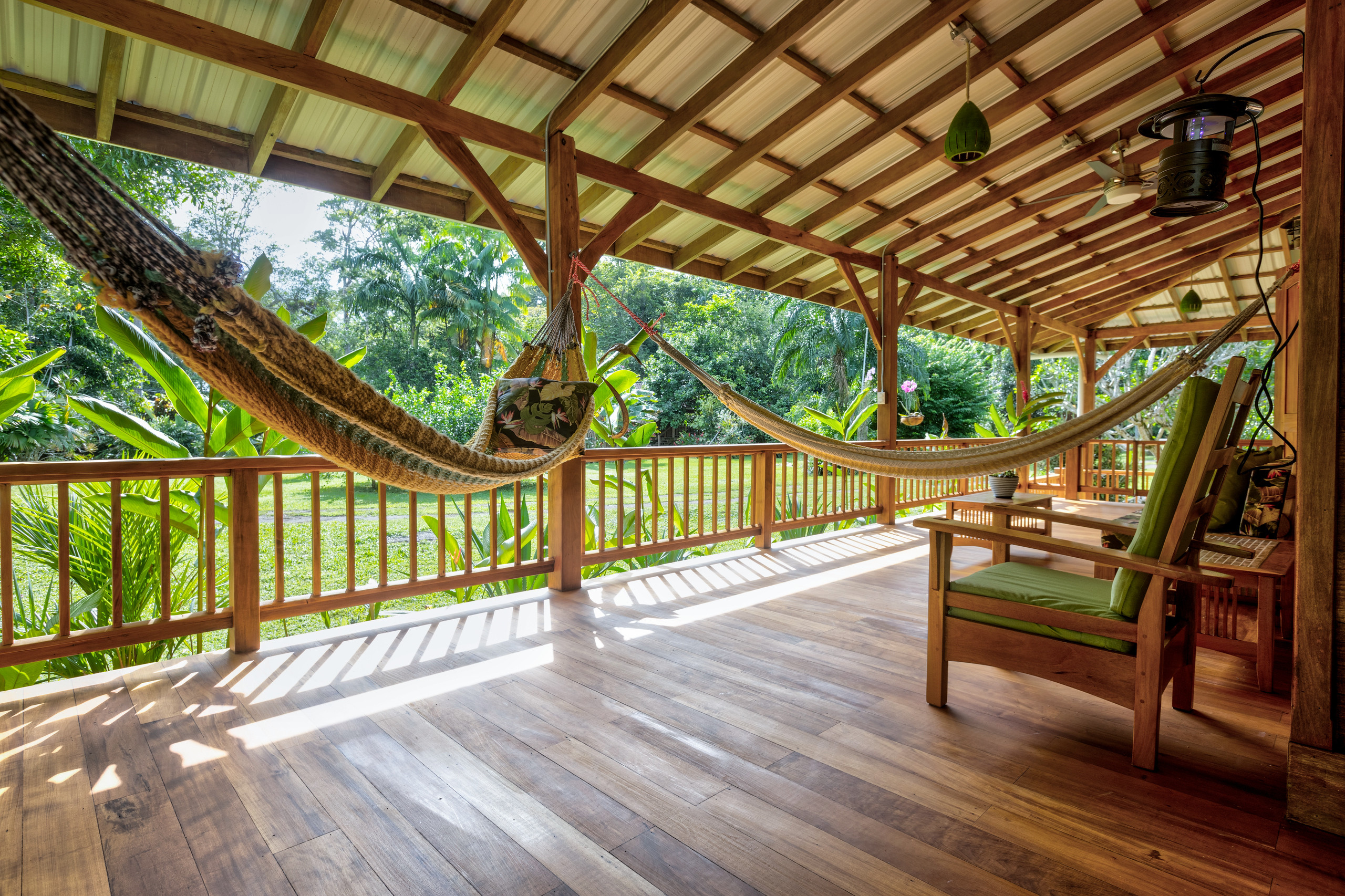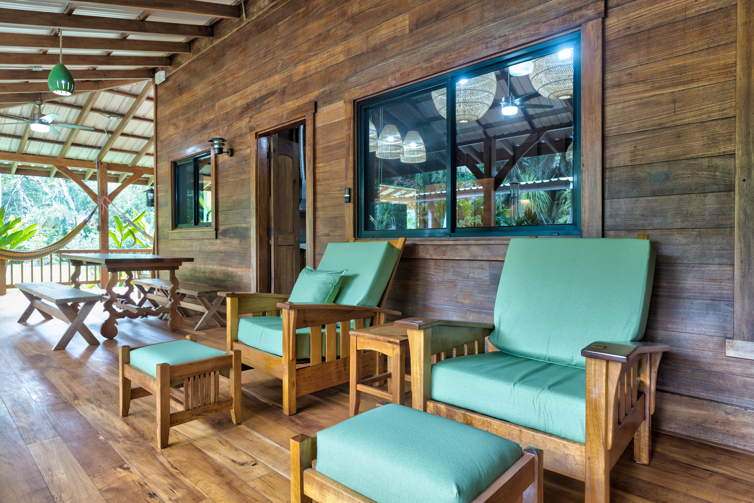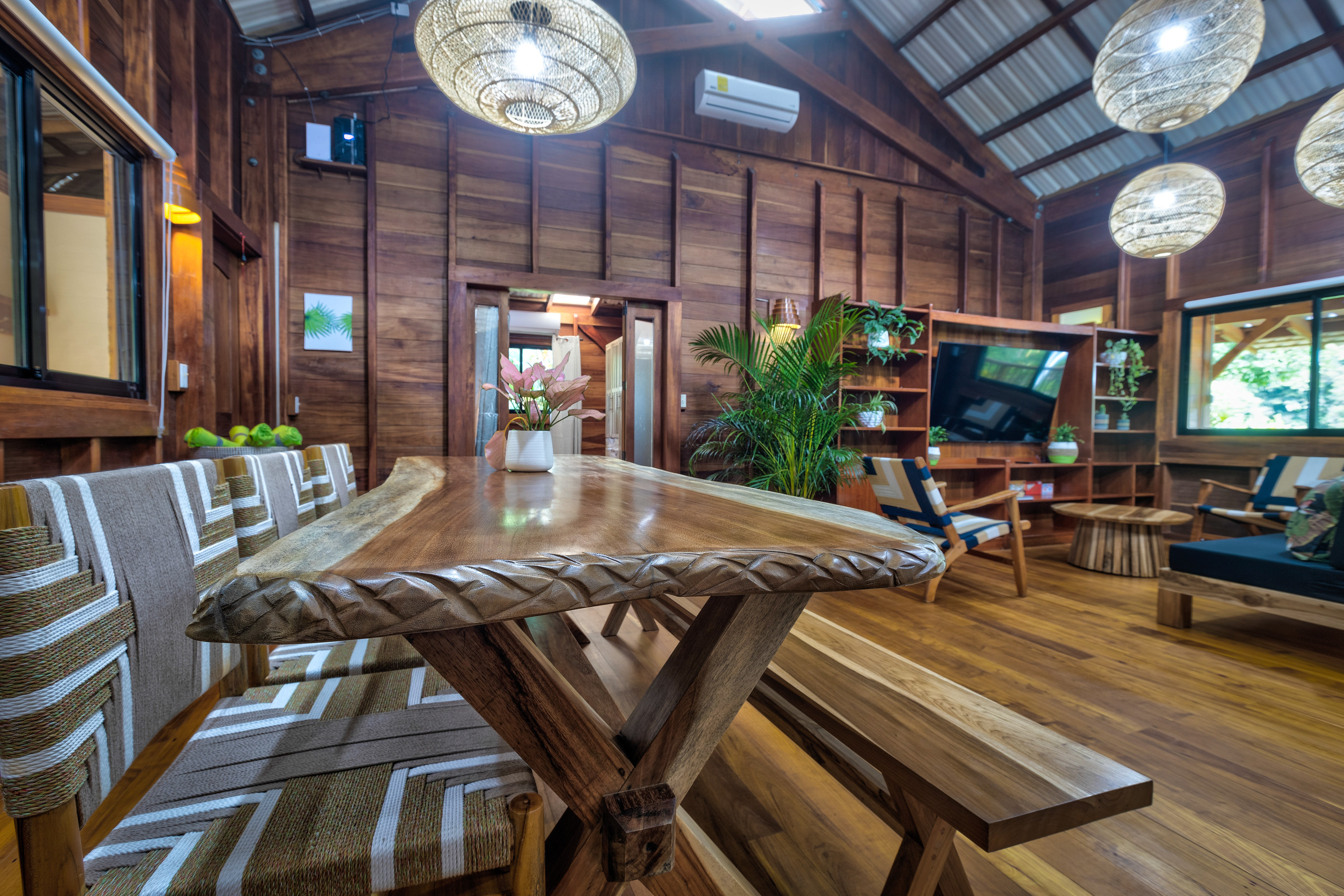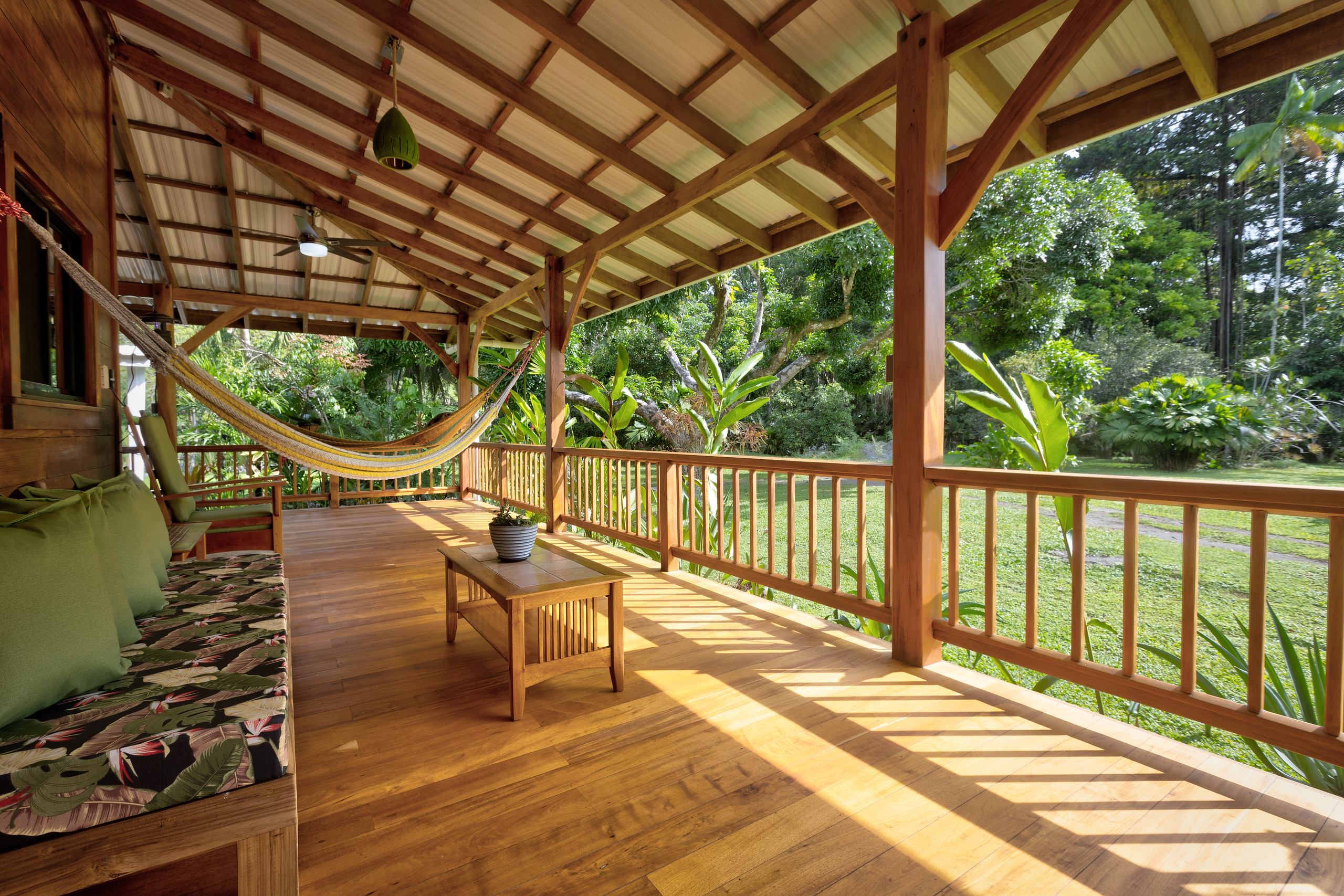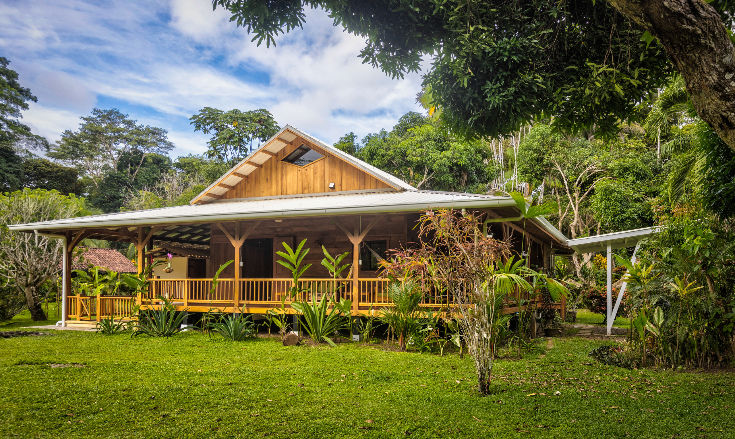 Designed with spaciousness and warmth in mind, the home features air conditioning in all bedrooms and the living area, a cozy TV lounge, and expansive decks ideal for enjoying morning coffee while watching sloths, monkeys, and tropical birds. The property showcases a variety of exotic fruit trees, including mangos, mangosteens, limes, bananas, soursop, jackfruit, sugarcane, and more.