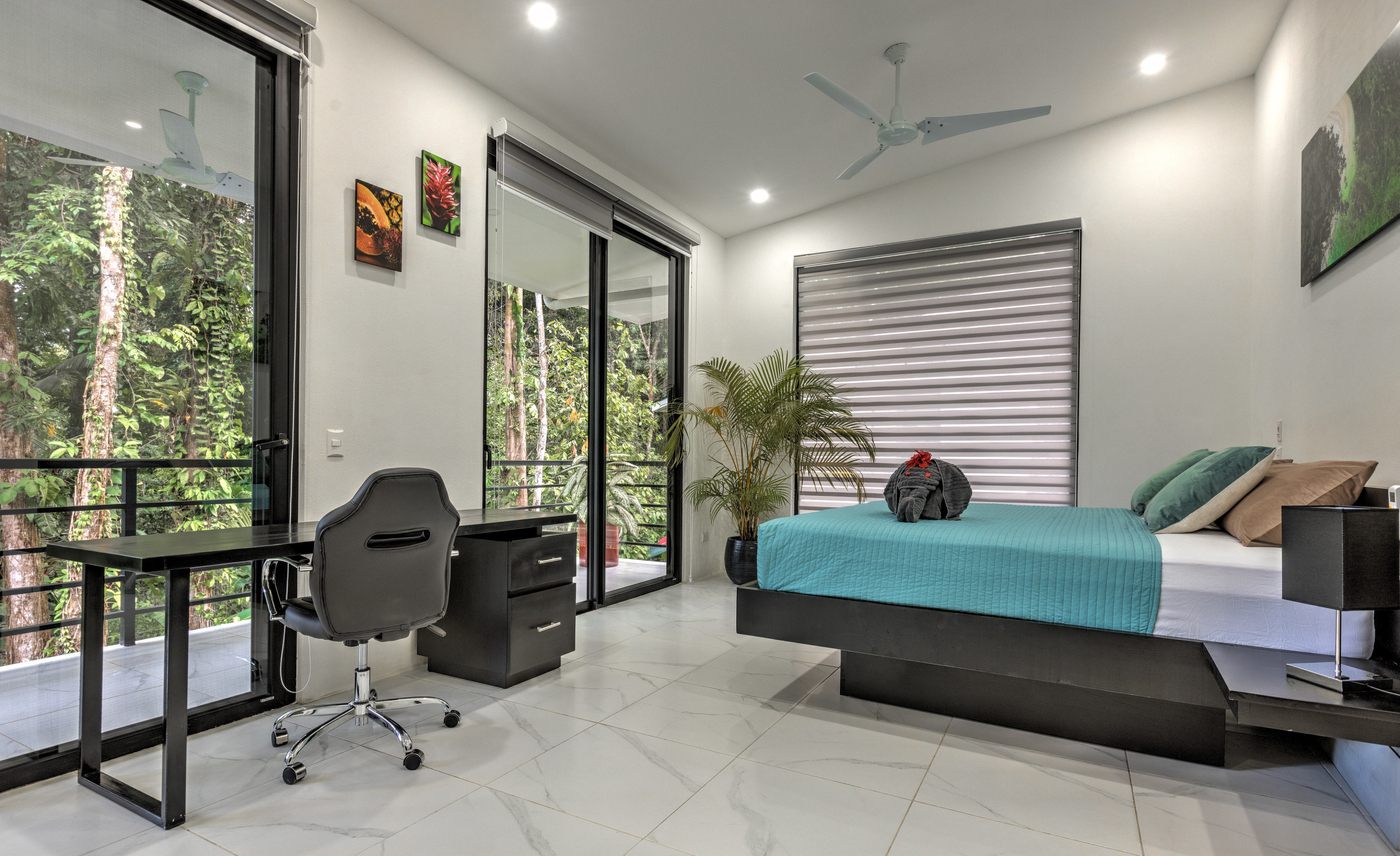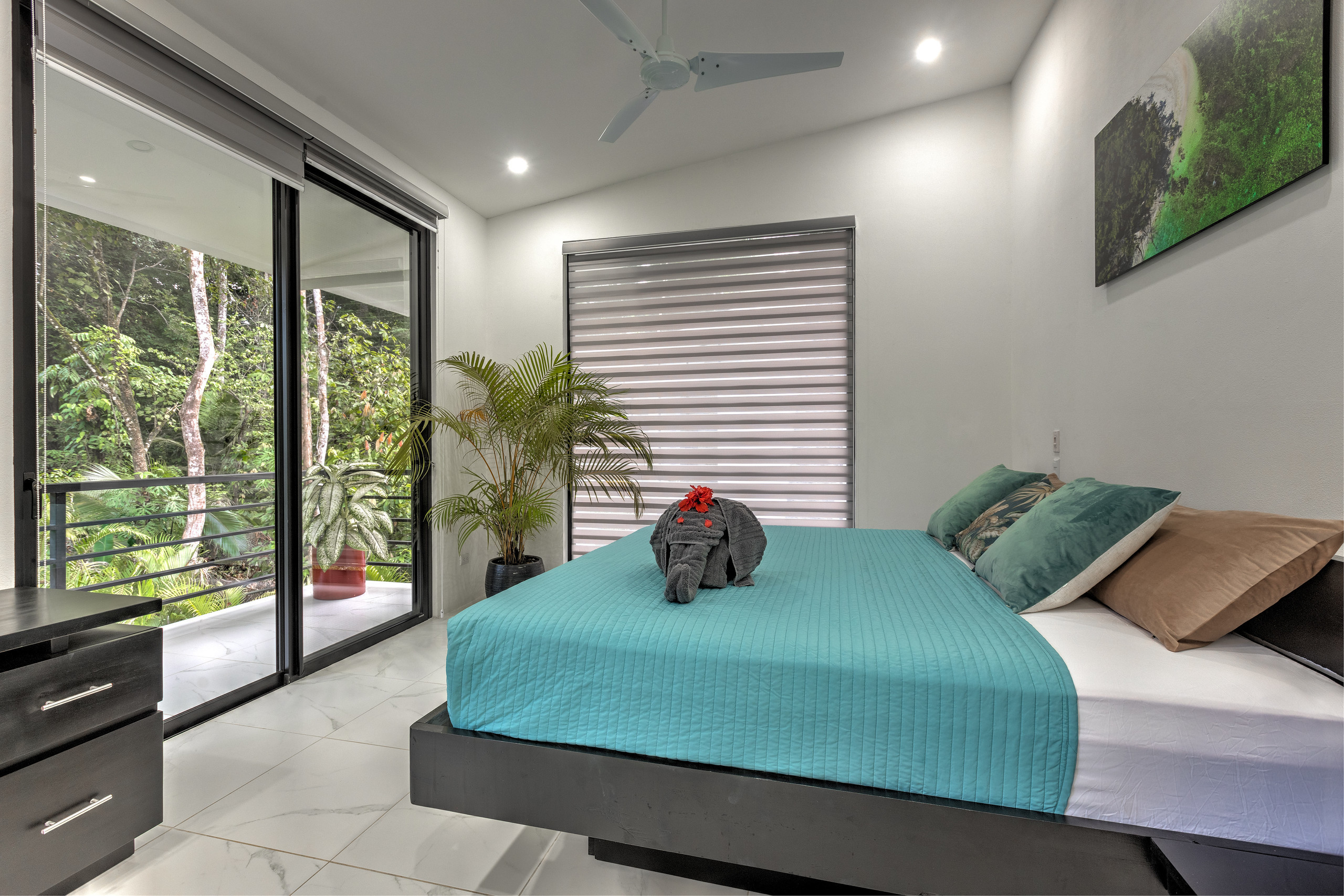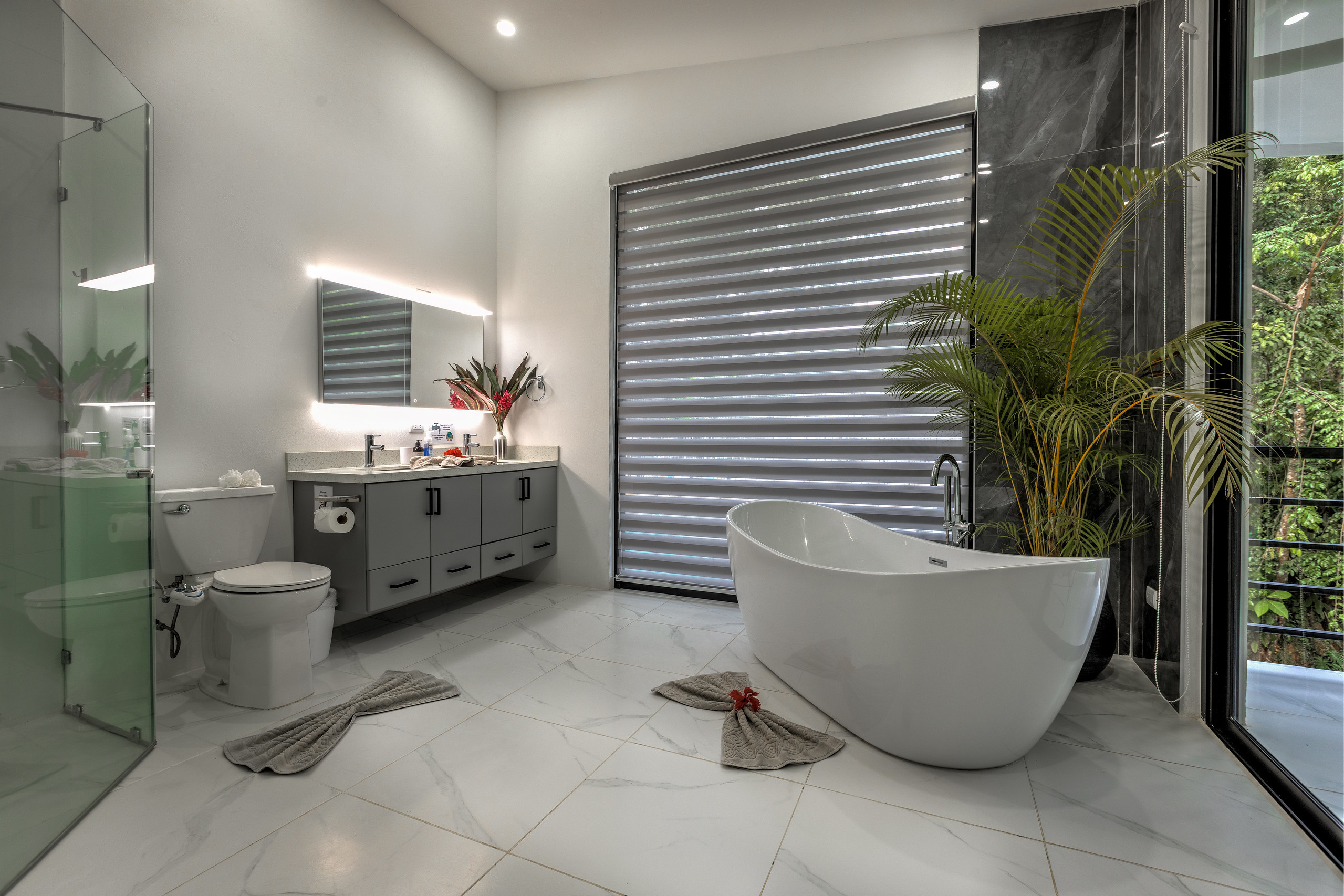 - Master Bedroom: A luxurious space with a king-size bed, walk-in closet, working desk, and large doors that open to stunning ocean and jungle views. The en-suite bathroom boasts a double showerhead, a bathtub, and a bidet, offering a spa-like retreat in the heart of nature.