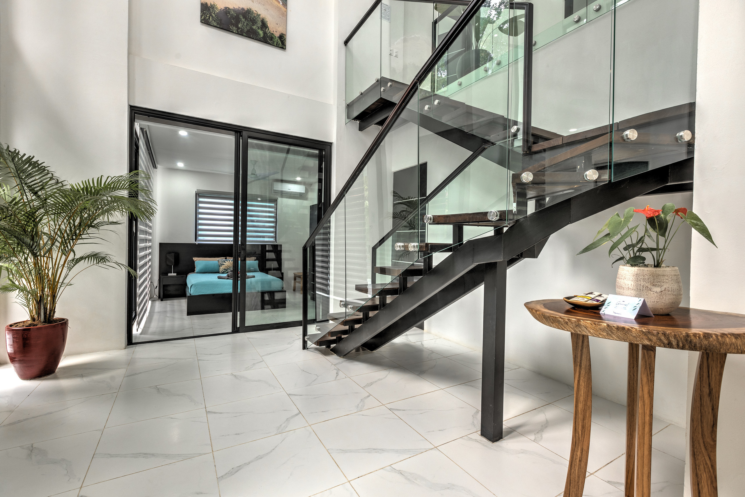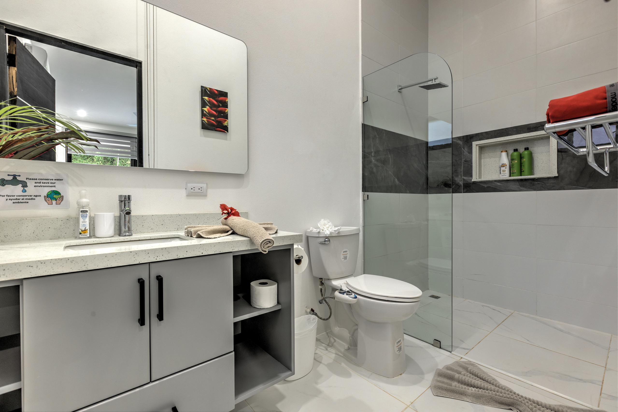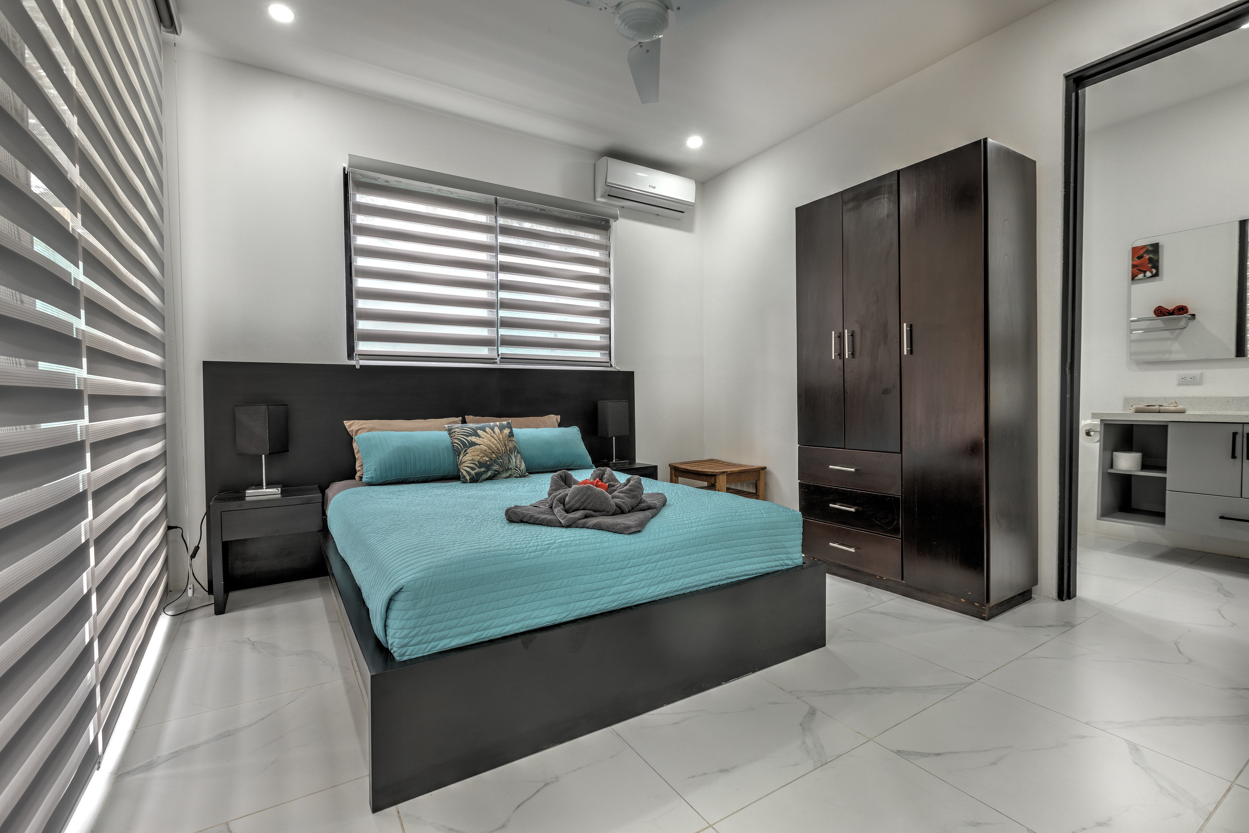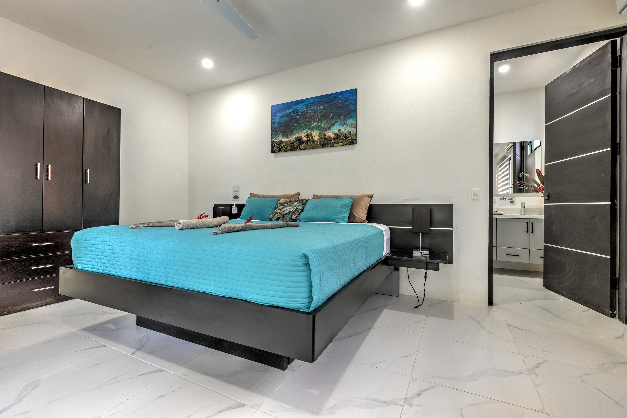 - Master Bedroom: A luxurious space with a king-size bed, walk-in closet, working desk, and large doors that open to stunning ocean and jungle views. The en-suite bathroom boasts a double showerhead, a bathtub, and a bidet, offering a spa-like retreat in the heart of nature.