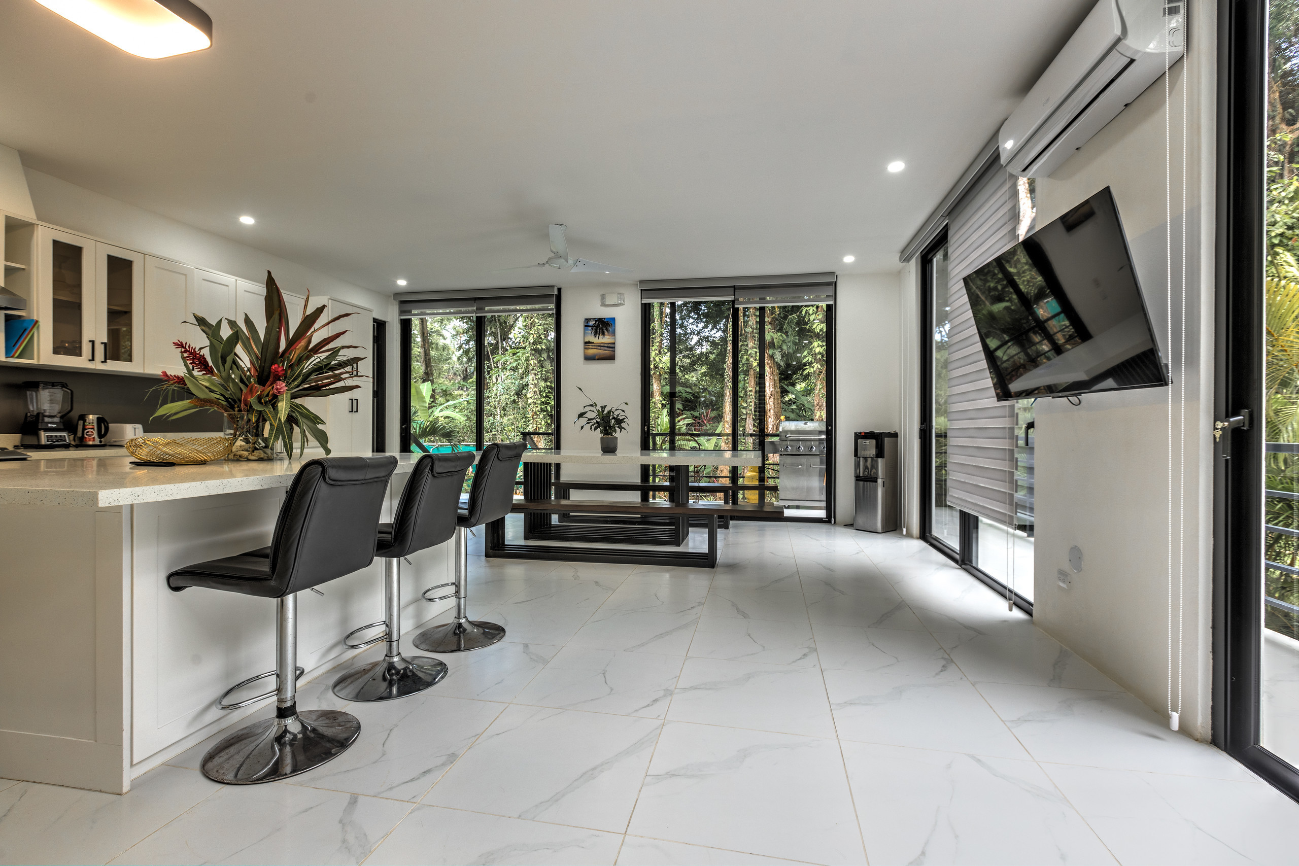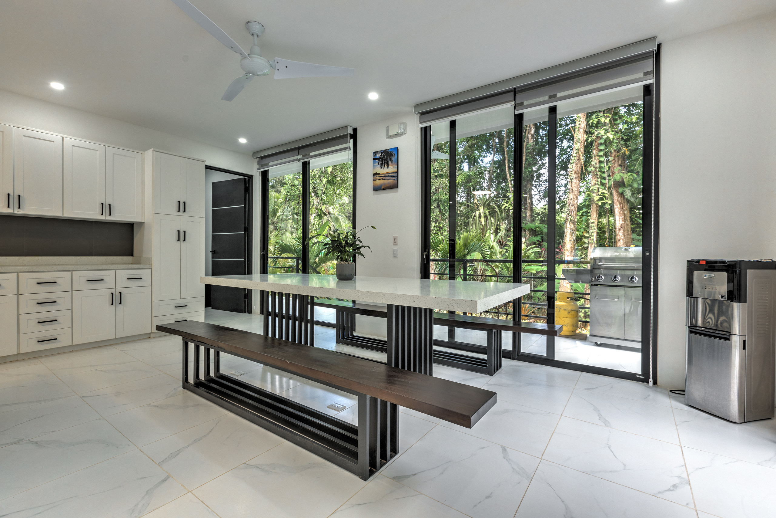 The fully equipped kitchen is a dream for cooking enthusiasts, featuring a double refrigerator, a large central island, and a 2-meter quartz dining table that seats 10 guests. Whether you prefer to cook or hire a private chef, this space is designed for enjoyment and convenience.